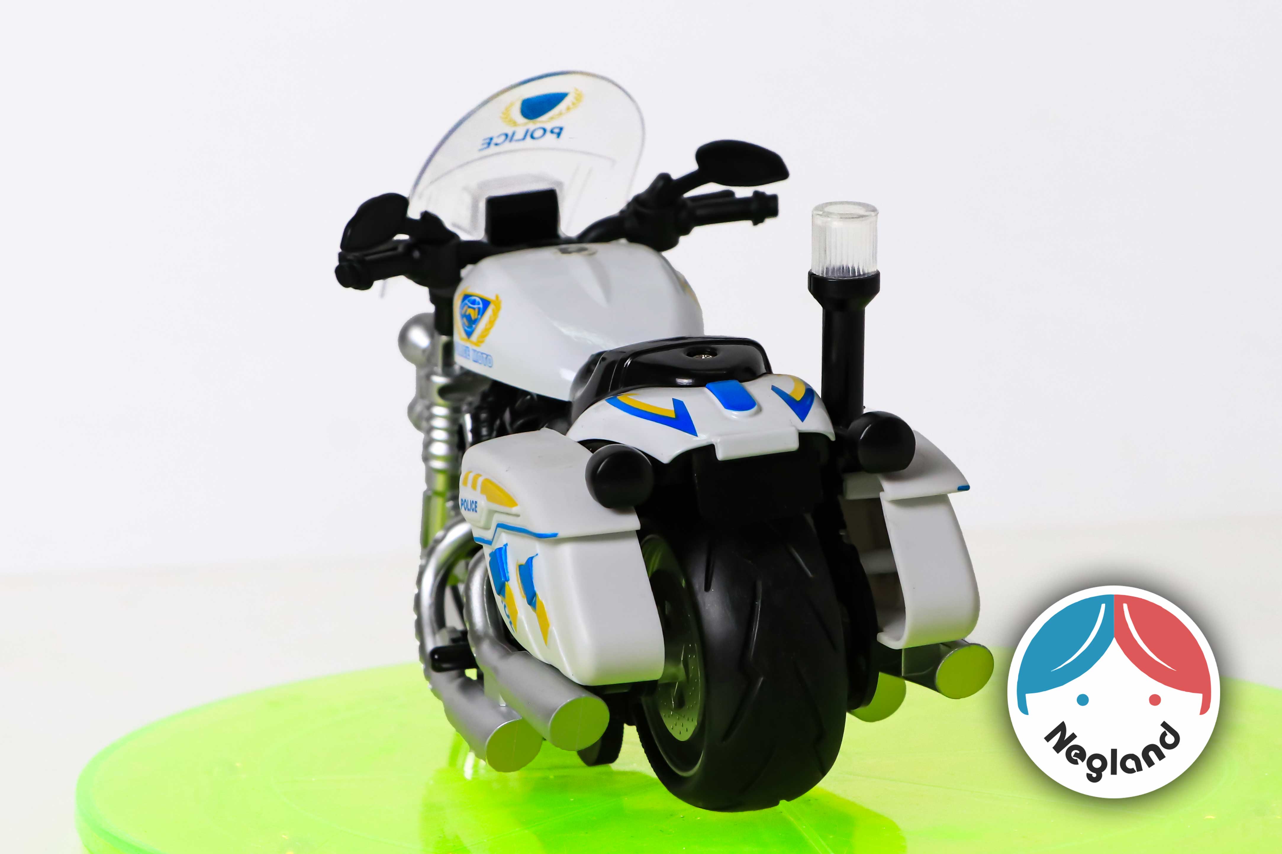 موتور عقب کش پلیس که با دکمه زیر موتور می توان چراغ های موتور و آجیر گردان عقبش رو روشن کرد و با دکمه دوم می توان روی حالت نمیه فعال قرار داد و با کشیدن به روی عقب هم شروع به موزیک پخش کردن می کنه و هم چراغ هایش شروع به کار می کند