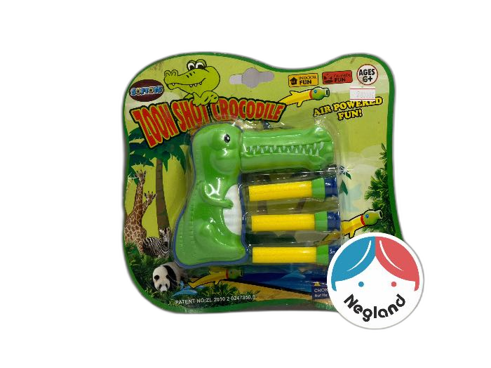 ظاهر تفنگ به شکل سر دایناسور سبزرنگ طراحی شده و همراه با چند عدد تیر فومی سبک ارائه میشود. عملکرد این اسباببازی به صورت فشاری و بادی (Air Powered) است، بدون نیاز به باتری و کاملاً ایمن برای بازی در منزل یا فضای باز.